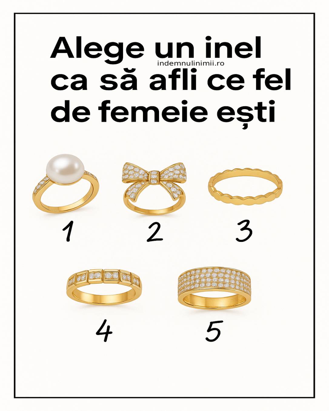 Privește cele cinci inele din imaginea de mai sus și alege-l pe cel care îți vorbește instantaneu. Nu te gândi prea mult; pur și simplu alege inelul care simți că te reprezintă cel mai bine. După ce ai făcut alegerea, citește descrierea de mai jos pentru a descoperi ce spune selecția ta despre tipul de femeie care ești.