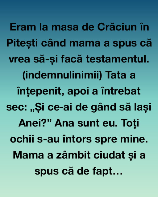 Eu nu știam ce să spun. Îmi venea să fug. Să ies în frigul de afară și să alerg până nu mai simt nimic. Nu aveam nevoie de casă. Nu pentru mine. Nici nu-mi doream un testament pe hârtie, ci o mamă în viață, o familie care să nu se dezbine în seara de Crăciun.