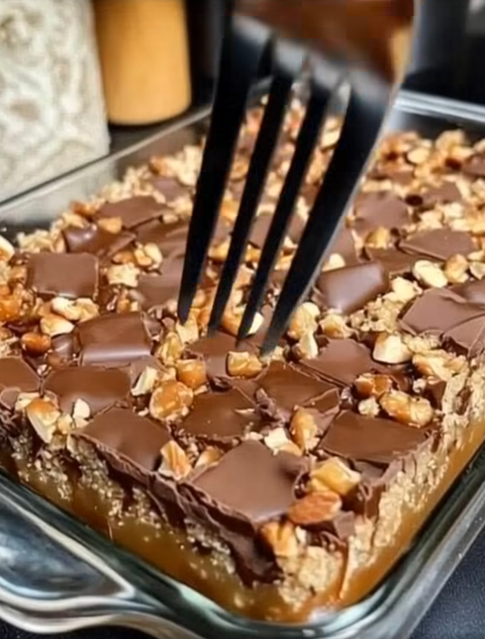 Prăjitură cu caramel, biscuiți, ciocolată și nuci